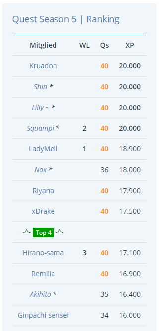 es gibt ein kleines Wertungs-Update. Alle Inhaber des Top 4 Awards wurden mit einem * markiert und zählen nicht für die Top 4 Wertung in Season 5!
