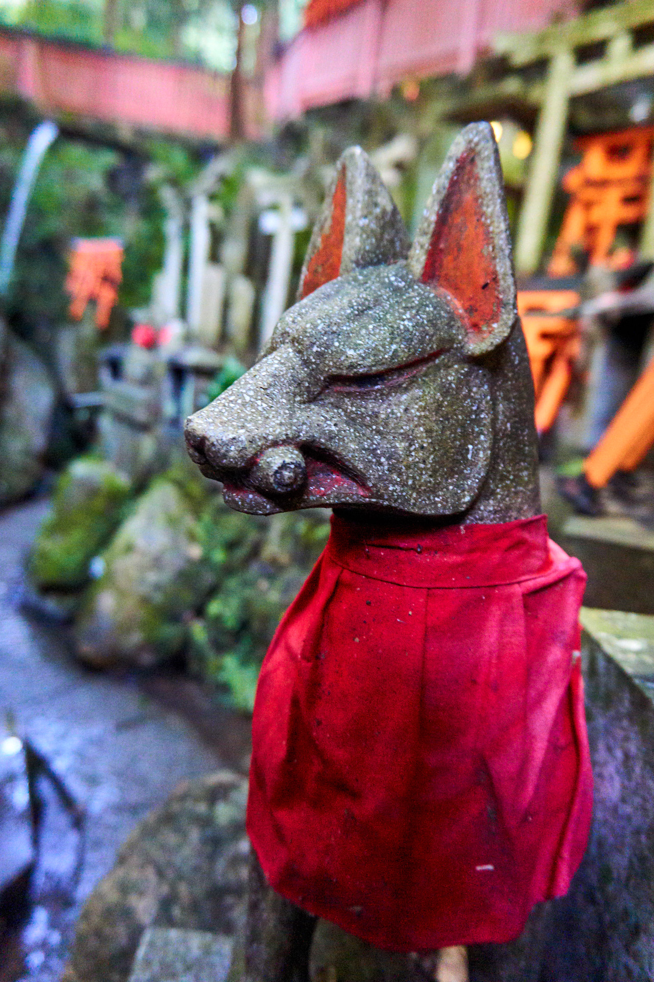 Fuchswächter der Gottheit Inari bei Fushimi Inari Taisha. Das rote Lätzchen gilt als besonders wirksam gegen böse Dämonen.