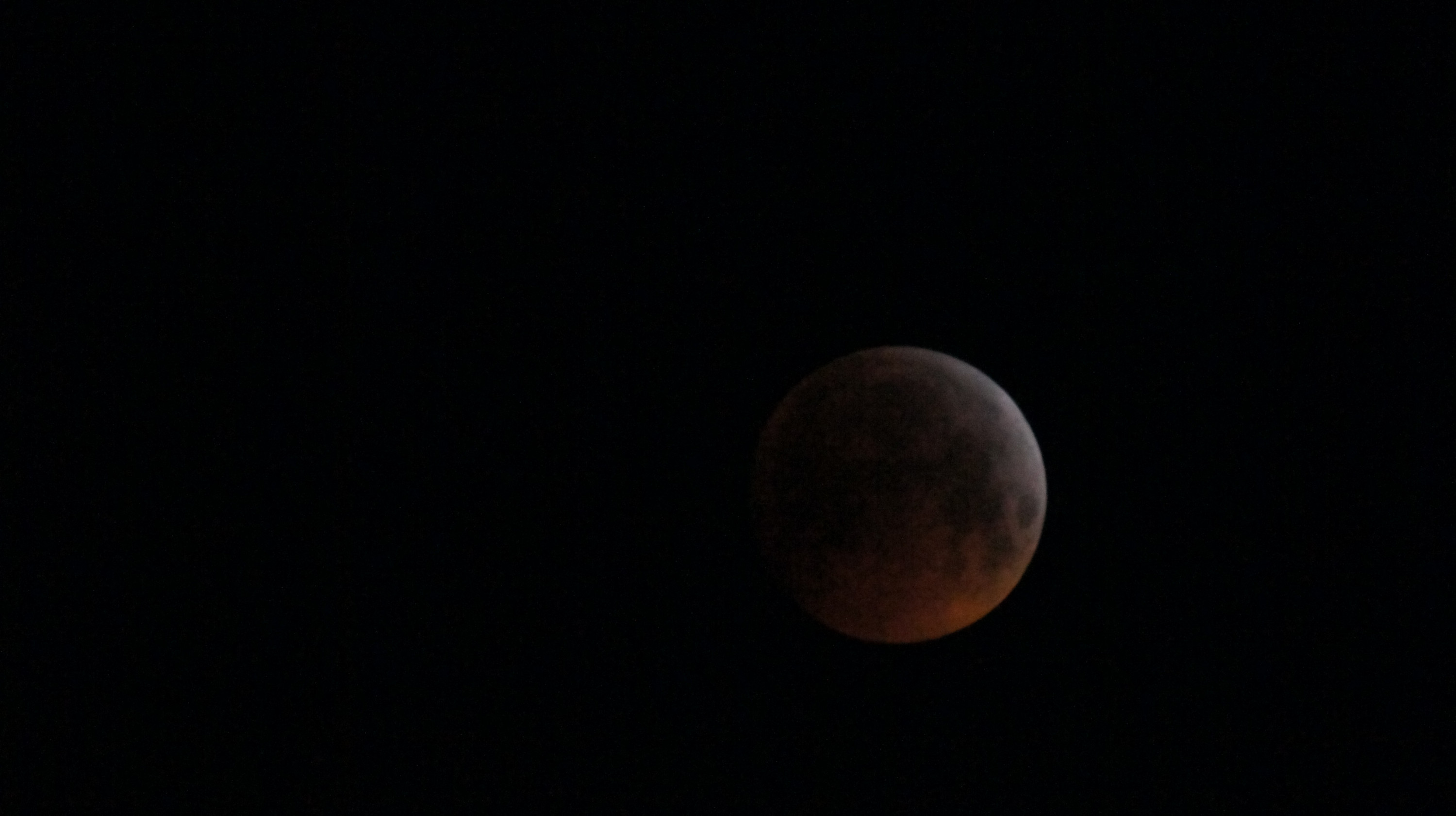 Und hier noch eines der wenigen halbwegs brauchbaren Bilder von der eigentlichen Mondfinsternis. Hier hätte ich tatsächlich auf ein lichstärkeres Objektiv setzen sollen, is mir aber zu spät eingefallen und bedingt dadurch das der Mond schon Minuten später hinter nem Hausdach verschwunden wäre, hatte ich praktisch keine Zeit mehr es zu wechseln. So gibts nur ein unsauberes Foto - aber besser als keins. Fürs nächste Mal weiss ich nun aber bescheid!