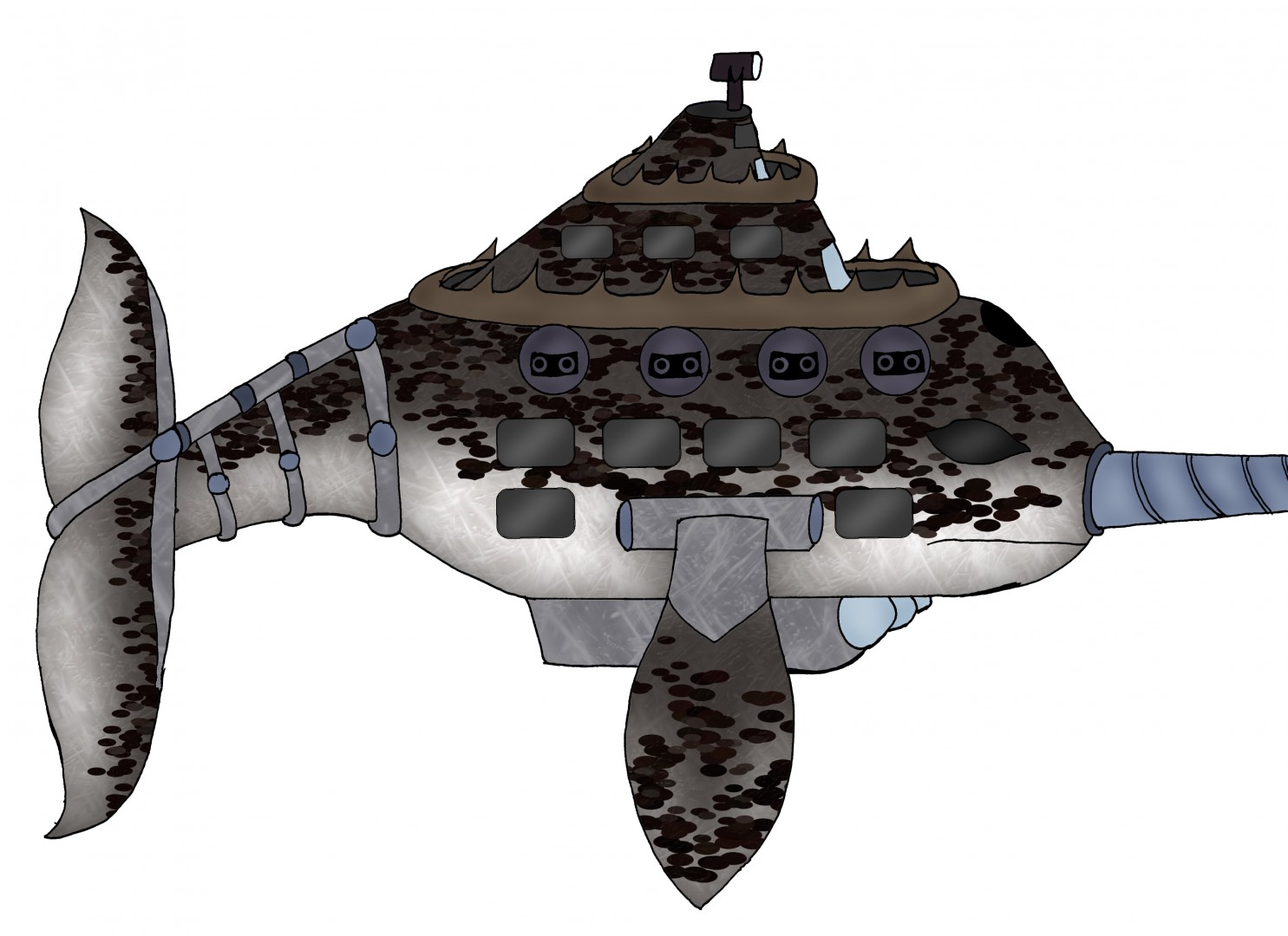 Waffen: Ingestamt 8 Gestütztürrme, 6 Torpedo-Mundüngen (2 bei der Flossenstuereung), eine Minenlagerung wo etwa 100 Minen im inneren platz haben und einen Bohrer Vorne an der ,,Schnautze“