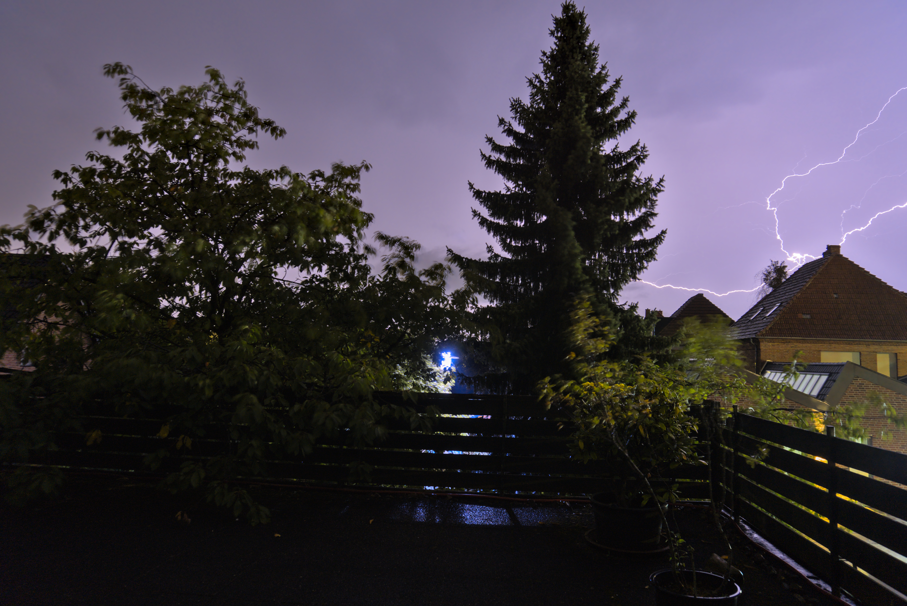Hier mal mein erster Versuch einen Gewitter aufzunehmen. Ich hab es mal mit Langzeitbelichtungen versucht, um überhaupt ein paar Blitze vor die Linse zu bekommen. Mein Timing war dabei nicht so berauschend, je nach Belichtungsdauer (15 - 20 Sekunden), dauerte auch die Verarbeitung des Bildes in der Kamera. In der "Wartezeit" gab es dann meistens die Lightshow, während der Aufnahmen war es dann ruhiger. Trotzdem hab ich zwei-drei Blitze ablichten können. Hier der erste Blitz und auch meine ersten Gehversuche in Sachen Bildbearbeitung.
