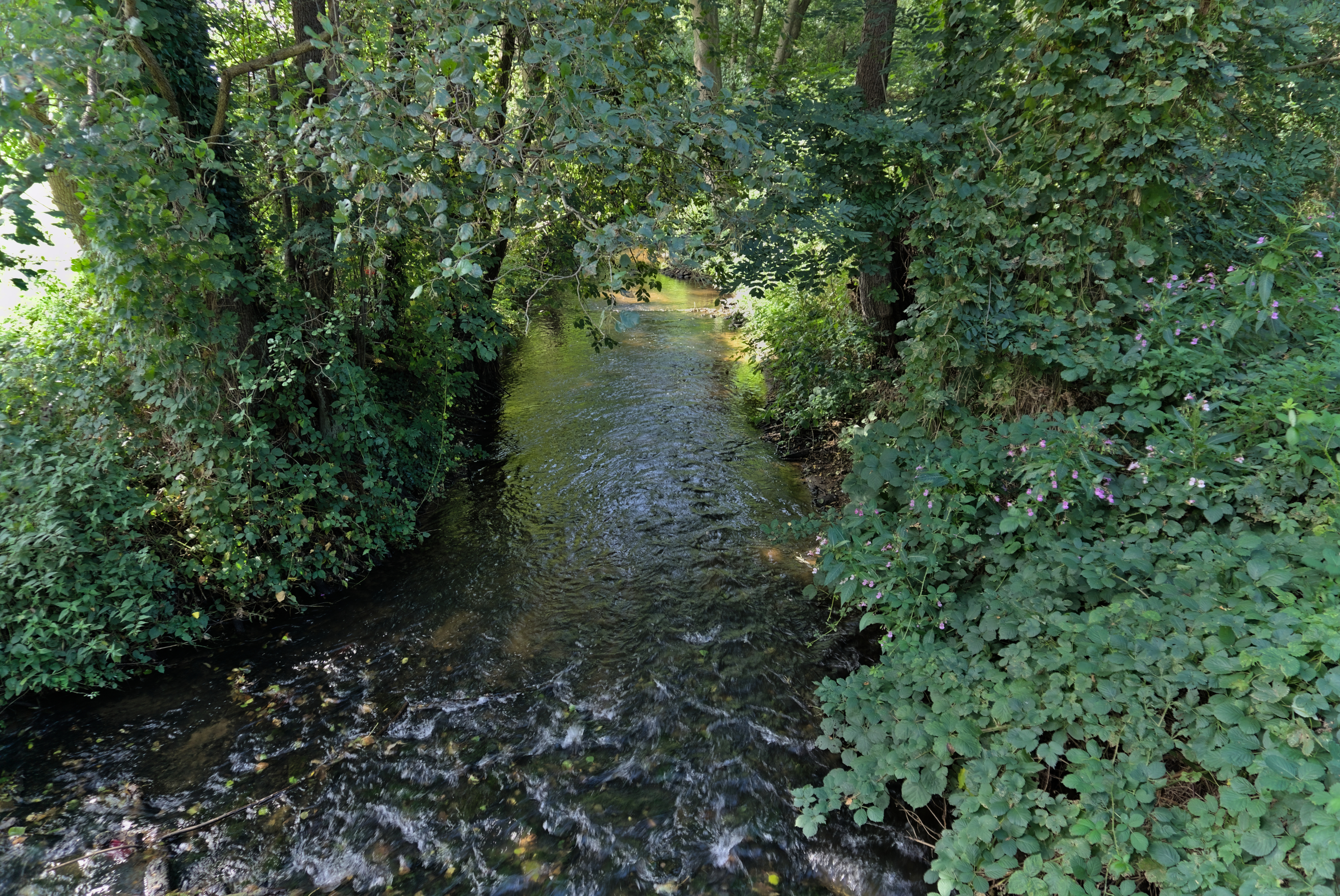 Hier ein zweites Foto. Dieses ist von unserem kleinen Bächlein, dem Ölbach. Der Ölbach ist insgesamt knapp 30 Km lang und ein nicht unerheblicher Teil davon liegt in der Gemeinde Verl. Verl wird daher auch die Ölbachgemeinde genannt - ja, wir lieben den Ölbach! Der Ölbach fließt am Verler See vorbei und mündet ein paar Kilometer weiter in die Wapel, welche in die Dalke mündet, welche ihrerseits in die Ems mündet. In und an unserem Bächlein soll es auch allerlei Getier geben, sogar Eisvögel. Ich selbst habe bisher bis auf verdammt viele Mücken und wirklich gewaltige Ratten noch keine gesehen. Aber es gibt sicherlich auch andere Arten!