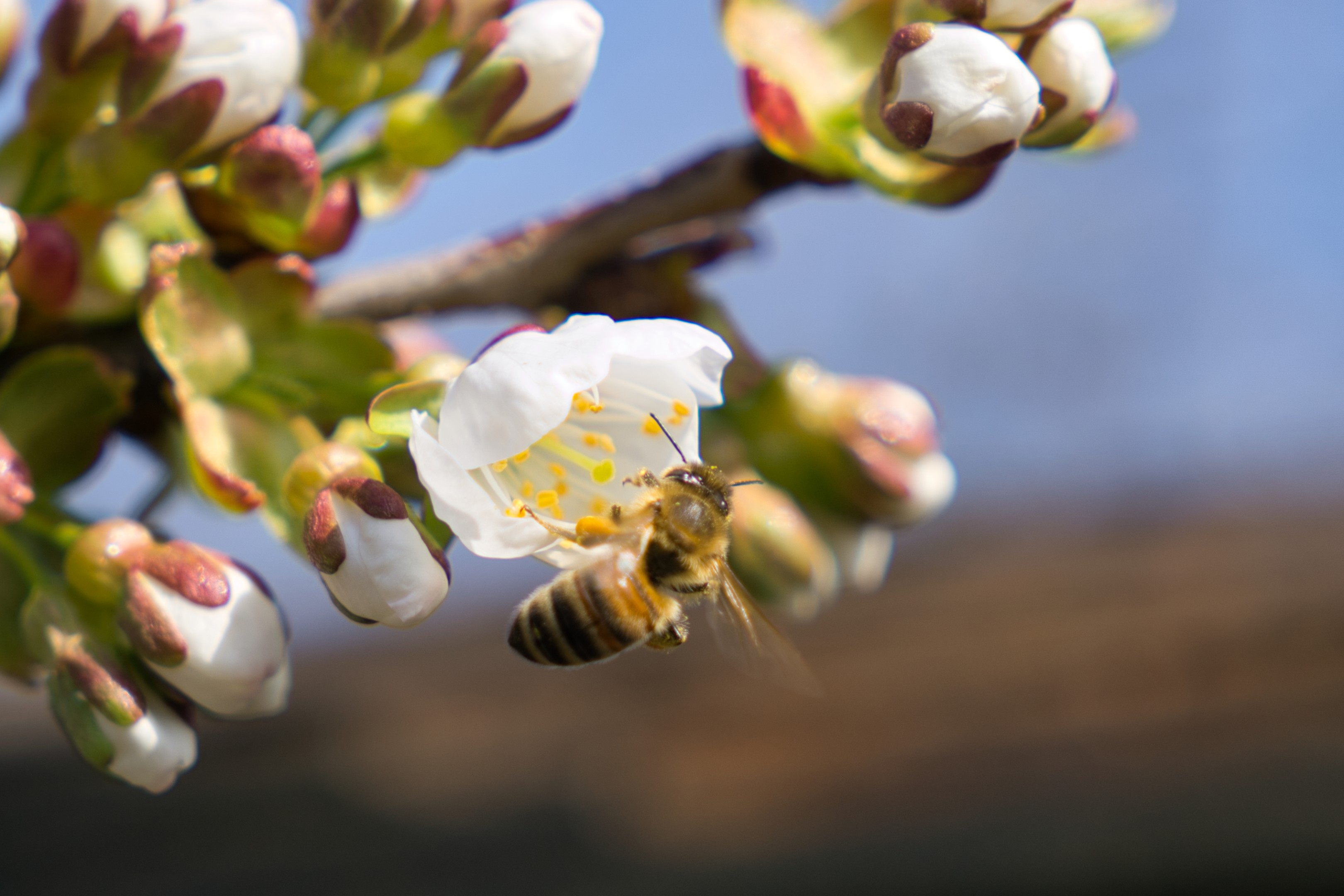 Diesmal im Flug, ganz kurz vor dem Aufsetzen, die ersten Beinchen haben schon angedockt. Ich hab ein paar mal versucht Bienen im vollen Flug zu erwischen, aber das ist mir bis jetzt noch nicht gelungen. Die Tierchen sind verdammt wendig und haben offenbar keinen festen Flugplan. Wenn ich eine im Visier hatte und auslösen wollte, war sie direkt wieder weg. Aber die unmittelbare Landephase ist ja auch was.