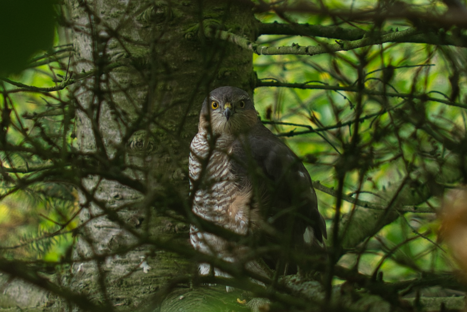 Heute hatte ich mal einen besonderen Gast vor der Haustür: einen Sperber. Der saß den ganzen Tag gemütlich auf nem Baum. Ich habe die Chance gleich mal genutzt und ihn durchs Fenster fotografiert. Fenster aufmachen oder draußen von unten wollte ich nicht, da er dann vermutlich weniger still gehalten hätte. So hab ich nun ein Vögelchen mehr in meiner Fotosammlung einen ersten Greifvogel!