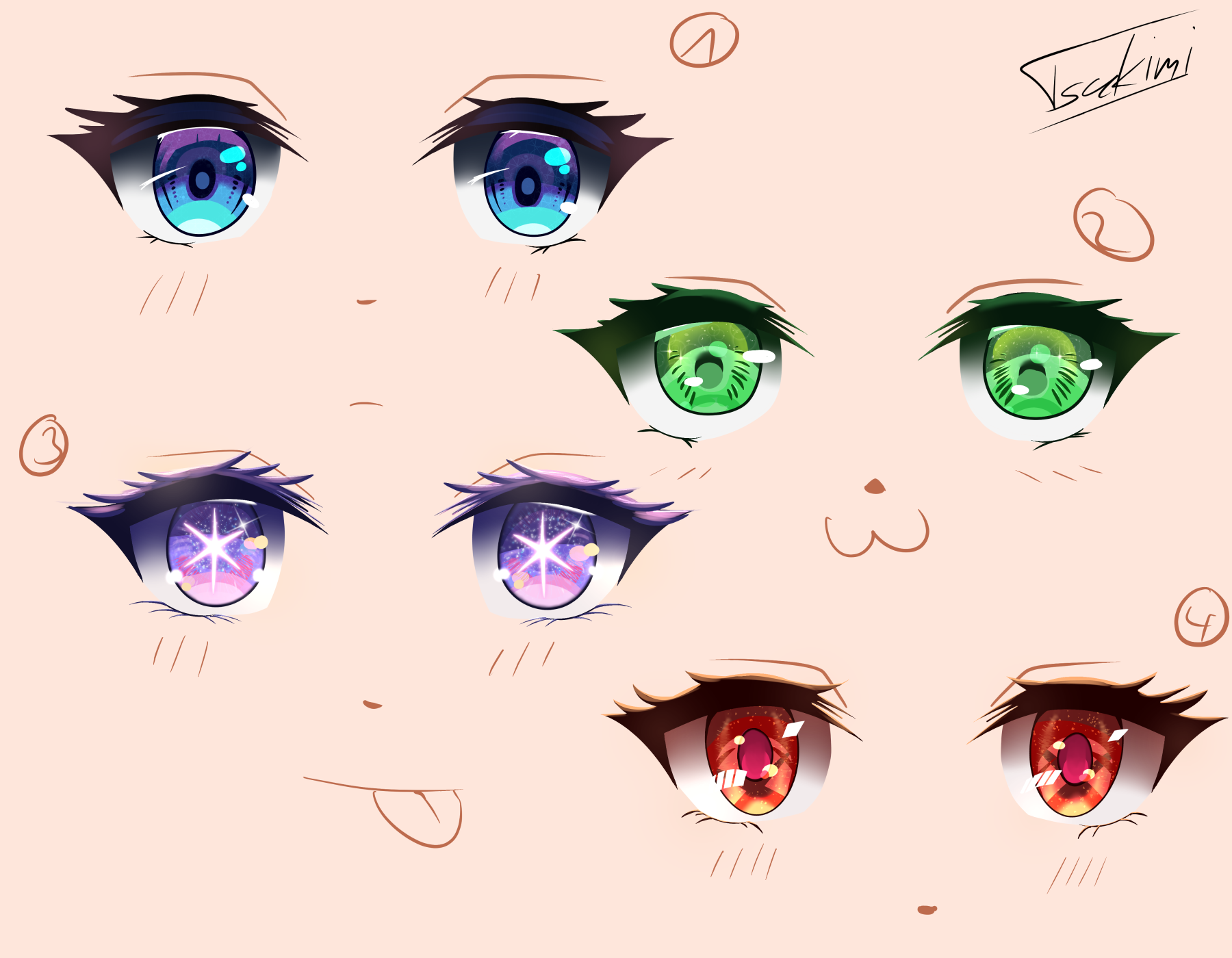 Nr.3 hat natürlich Ai's Augen aus "Oshi no ko" als Inspiration. Anfangs fand ich den Stern zu viel. Aber mit jedem Kapitel und nun auch noch dem Anime ... sagen wir, irgendwie habe ich mich daran gewöhnt und finde es mittlerweile ganz süß.