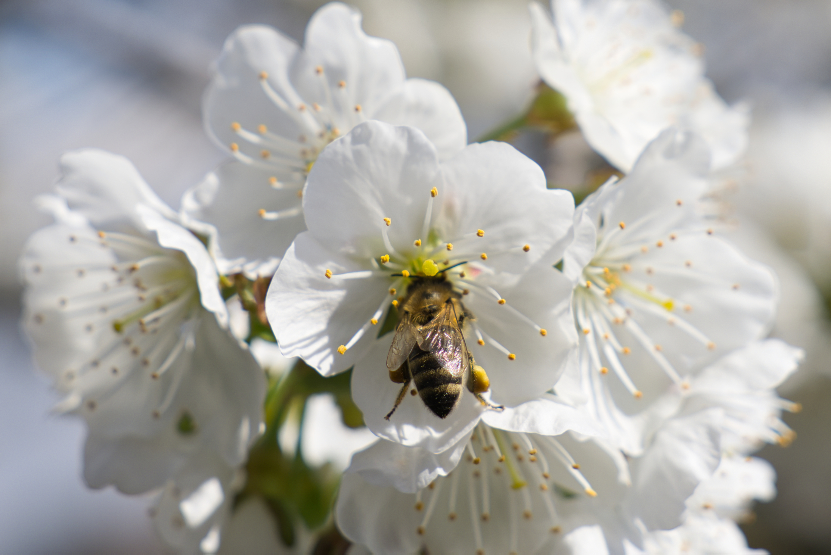 Dieses Jahr hat es doch recht lange gedauert, bis die Kombination aus Kirschblüten, Bienen und natürlich reichlich Sonne es mir erlaubte Fotos zu machen. Vor ein paar Tagen war es dann endlich soweit und ich hab meine Kamera direkt zum Glühen gebracht. Es kamen insgesamt knapp 800 Fotos in wenigen Stunden zusammen - interssanterweise sind sogar recht viele was geworden. Auch ist es immer wieder interessant, wie nah einen die kleinen Tierchen an sich heranlassen. Man wird fast vollkommen ignoriert. Wenn es die kommenden Tage erlauben, werde ich noch weitere Fotos machen um auch noch den letzten Rest Platz auf meienr Festplatte auszunutzen.