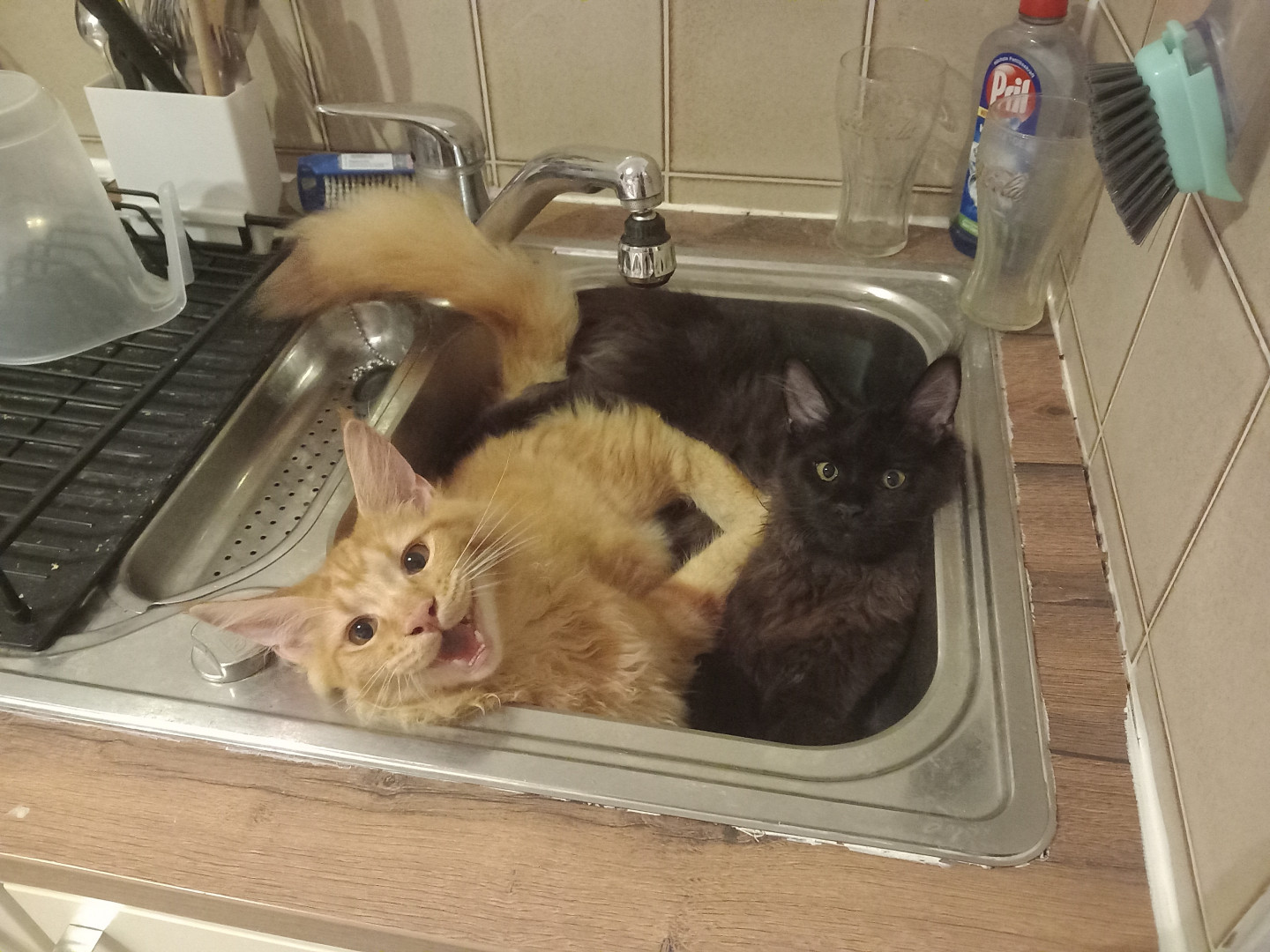 Nachdem Luna gemeint hat, ein Trinkglas zu zertrümmern und sich damit einen dicken Einlauf eingefangen hat, war den ganzen Tag lang erstmal Ruhe. Beide Katzen haben gemerkt, dass ich sauer war und haben den kompletten Tag durchgepennt und haben keinen Laut von sich gegeben. Um Mitternacht ging die Party aber wieder los. Und als ich in der Küche ein Rumpeln gehört hatte, habe ich das vorgefunden. Die Spüle ist für zwei Maine Coons dann doch ein bisschen zu klein.