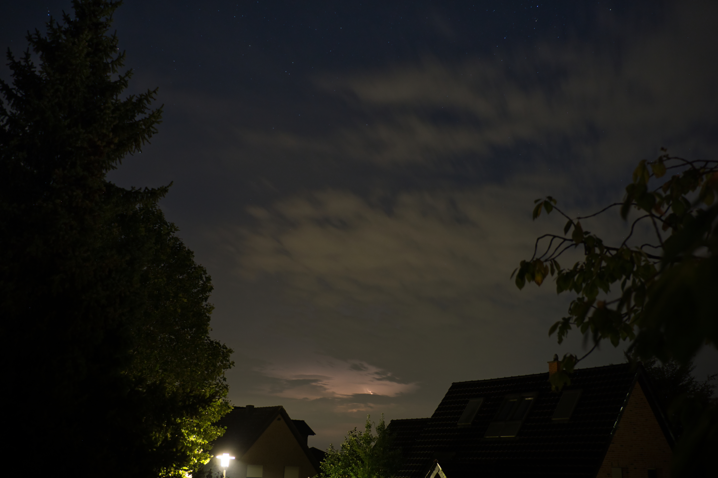 Ein Bild aus dem Sommer. Ich hatte mich beim Blick aus dem Fenster über ziemlich heftiges ständiges Aufleuchten gewundert. Also hab ich nachgeschaut und siehe da, Wetterleuchten. Das war anfangs so hell, das es hier eine ordentliche Lightshow gab. Das dafür verantwortliche Gewitter war laut Blitzortung etwa bei Minden, also 50-60 Km entfernt. Ich hab dann einfach mal mit der Kamera draufgehalten. Mir gefällt das Endergebnis, Gewitter in der Ferne und bei mir bis auf ein paar abziehende Wolken schon fast wieder sternenklar (die Wolken auf dem Bild waren die letzten größeren)