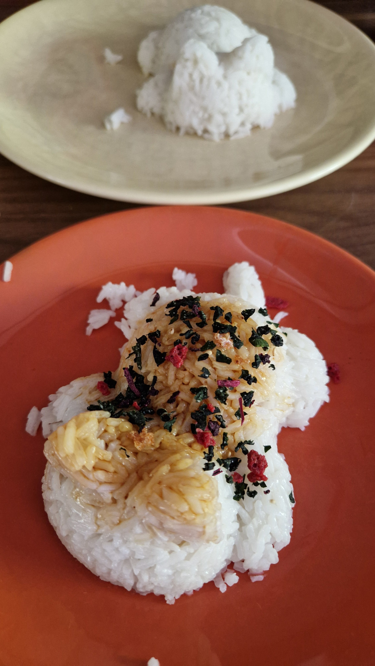 Ich hatte den Tipp bekommen, Bonitoflocken mit Sojasoße zu mischen und als Onigirifüllung zu verwenden. Da es heute schnell gehen musste, habe ich einfach normalen Reis in das Förmchen gemacht und damit gefüllt. Schnell und lecker. Das weiße ist mit Erdnussbutter.