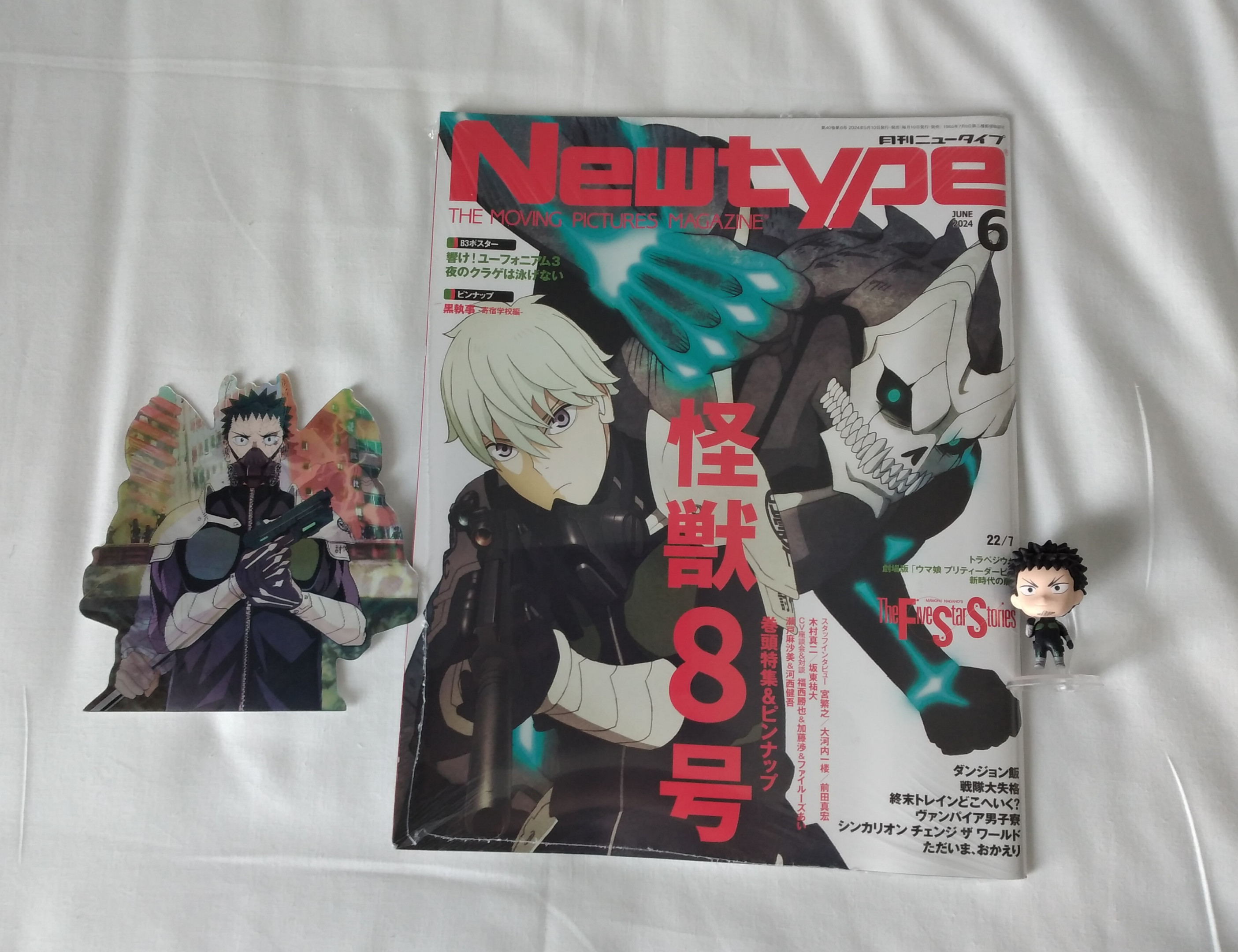 Meine kleine Ausbeute von der DoKomi Kaiju No.8 Merchandise. Links ein 3D Sticker, eine Newtype und eine kleine Kafka Figur