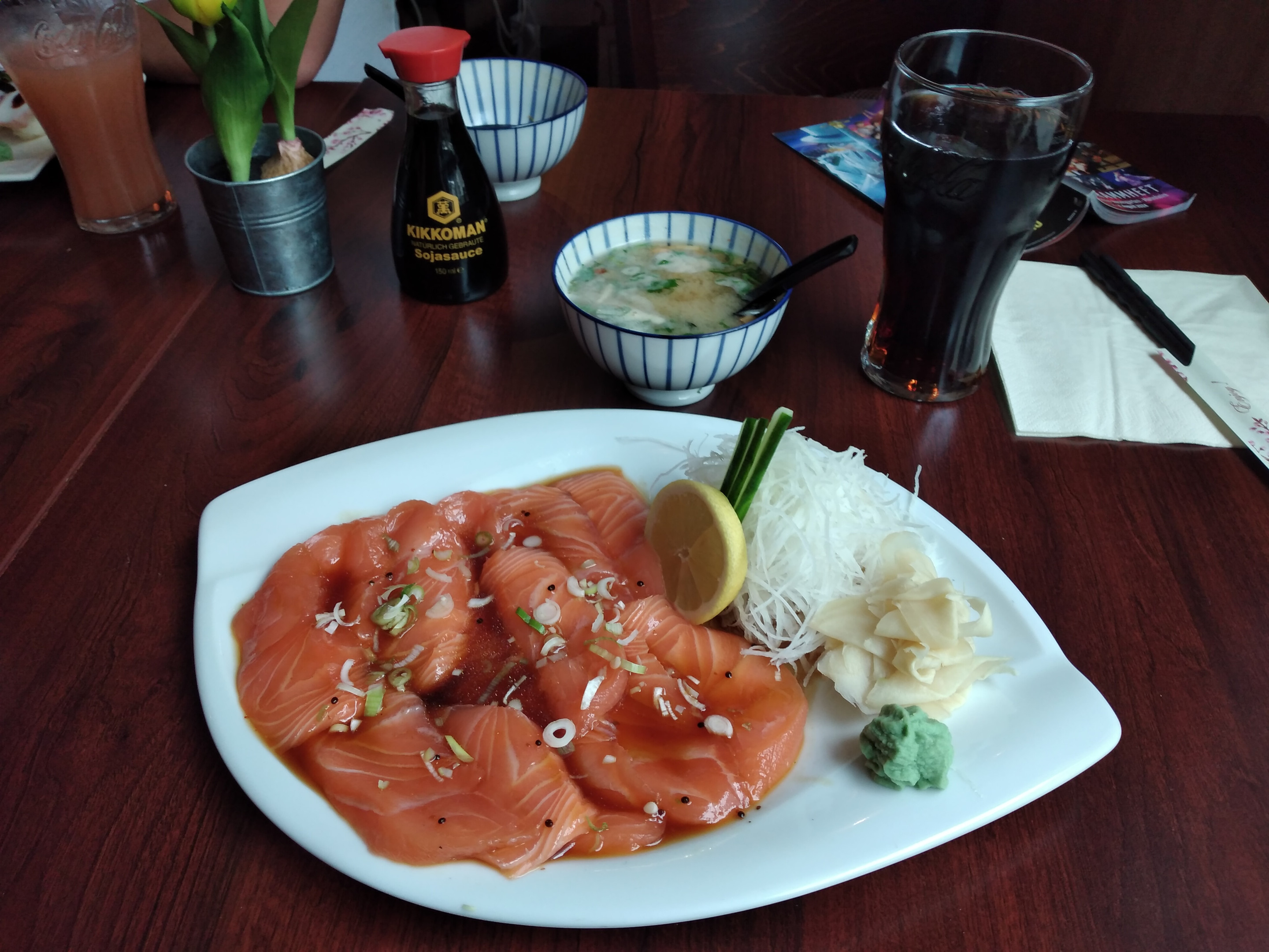Heutiges Abendessen Misosuppe und Lachscarpaccio.