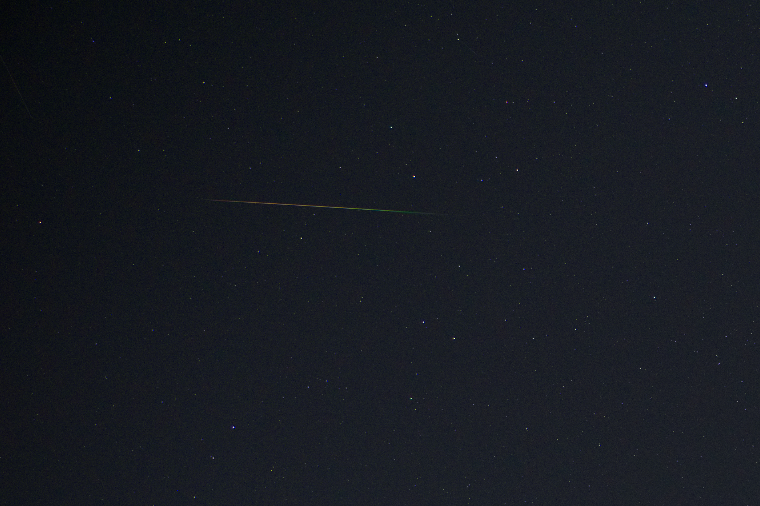 Vor gut einer Woche war wieder einmal das Maximum der Perseiden, in der Nacht vom 12. auf den 13. Die Nacht war, abgesehen von einigen wenigen durchziehenden Wolken überwiegend klar, aber natürlich hat Freund Mond, obwohl schon etwas abnehmend, sehr hell gestrahlt. So waren insgesamt nicht beonders viele Meteore zu sehen, nur besonders helle. Für meine kleine Planeten-Cam war das zu hell, also dachte ich mir, ich versuchs mal mit Alpha und den 18mm vom Sigma - ursprünglich wollte ich eine Intervallaufnahme machen, mein Lappy wollte sich aber mal so gar nicht mit der Kamera verbinden... Also alles manuell gemacht. Ausgerichtet war die Kamera auf Polaris, der Radiant der Perseiden lag also etwas östlich, eigentlich ein Garant für gute Bilder. Am ende waren es irgendwas zwischen 400 und 500 Bildern im Kasten....und ganze vier Treffer. Außerhalb des Aufnahmegebiets war ein wenig mehr los und ohne Mond wären vielleicht noch ein paar mehr eingefangene Schnuppen möglich gewesen. Aber seis drum. Hier mal die erste Schnuppe, mit der für die Perseiden typischen grünen Leuchtspur.