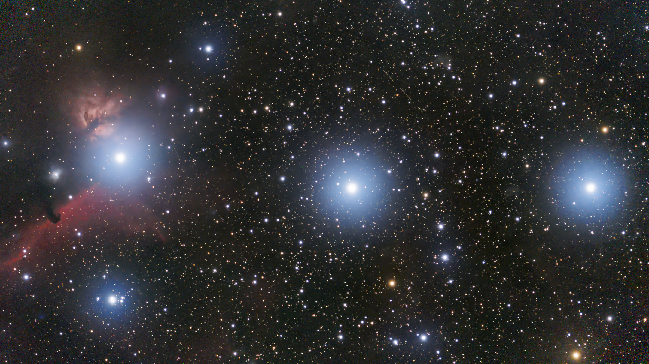 Eins hab ich noch aus meinem Orion Shooting. Mein Lieblingsbild bisher, eine der wohl bekanntesten Regionen des nächtlichen Himmels: die Gürtelsterne des Orion (v.l.n.r.) - Alnitak (Zeta Orionis), Alnilam (Epsilon Orionis) und Mintaka (Delta Orionis). Dazu noch Pferdekopf- und Flammennebel (IC 434 und NGC 2024) - da sieht man dann auch mal sehr schön, wo sich die beiden Nebel überhaupt befinden. Ferner sind auf dem Bild noch zu sehen: die Refelxionsnebel IC 431 und 432, etwas oberhalb von Alnitak, sowie der Emissionsnebel IC 423 (das verwaschene Fleckchen links von Mintaka ) und der Reflexionsnebel IC 426 (etwa mittig oberhalb zwischen Alnilam und Mintaka).