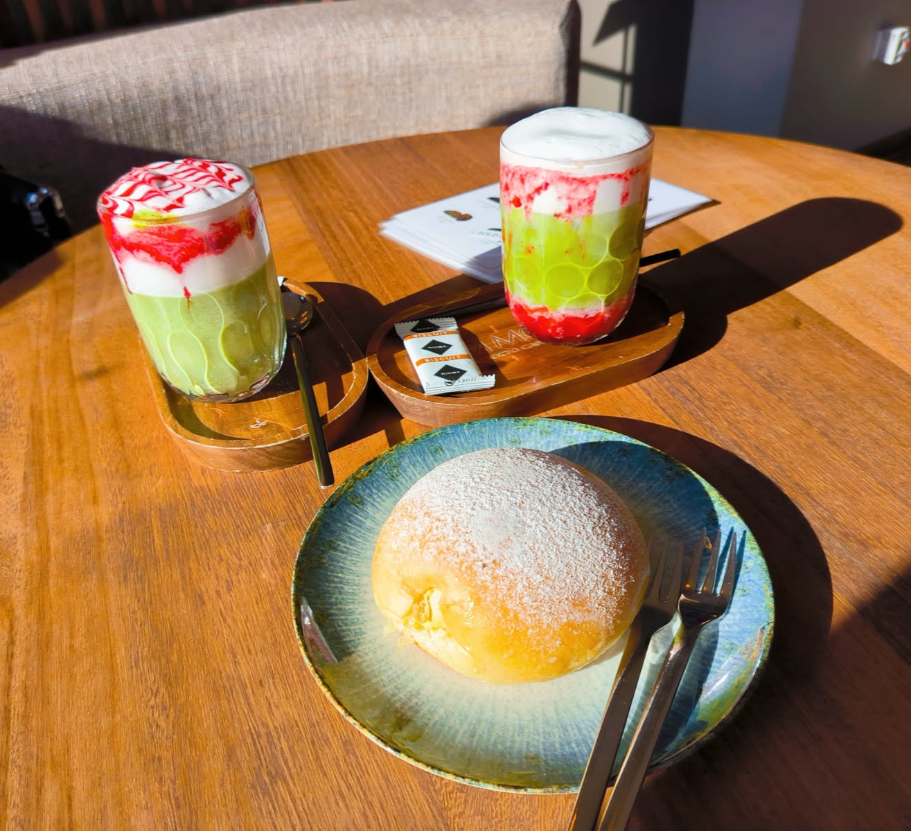 Strawberry Matcha Latte. Links die warme Variante und rechts die kalte Variante. Beides gut, wobei ich den kalten Latte geschmacklich besser finde.