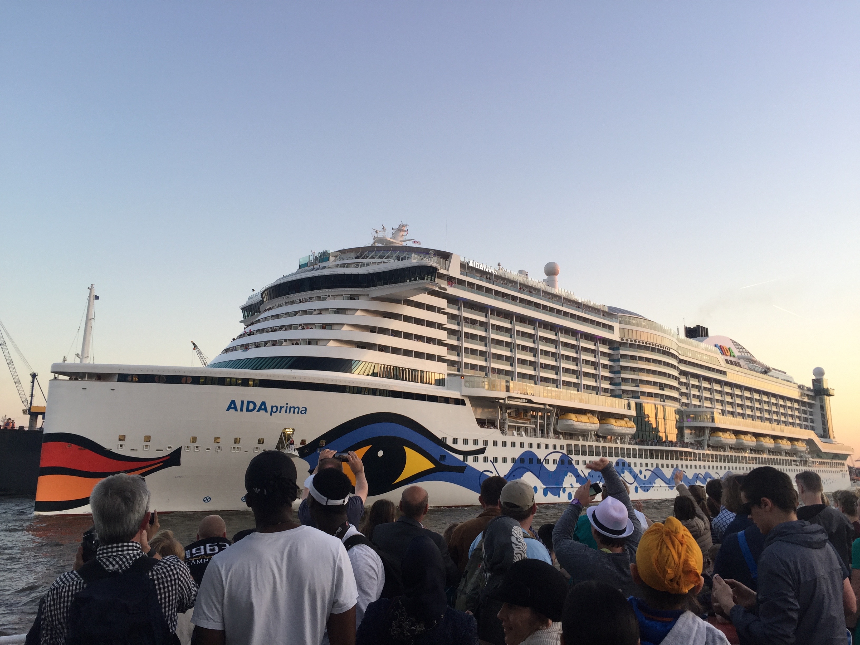 Die AIDAPrima nach der Taufe beim 827. Hamburger Hafengeburtstag. Ein riesiges Schiff, als ob ein Wohnblock mit Badeanstalt, Kino und Konzertsaal an einem vorbei schwimmt.