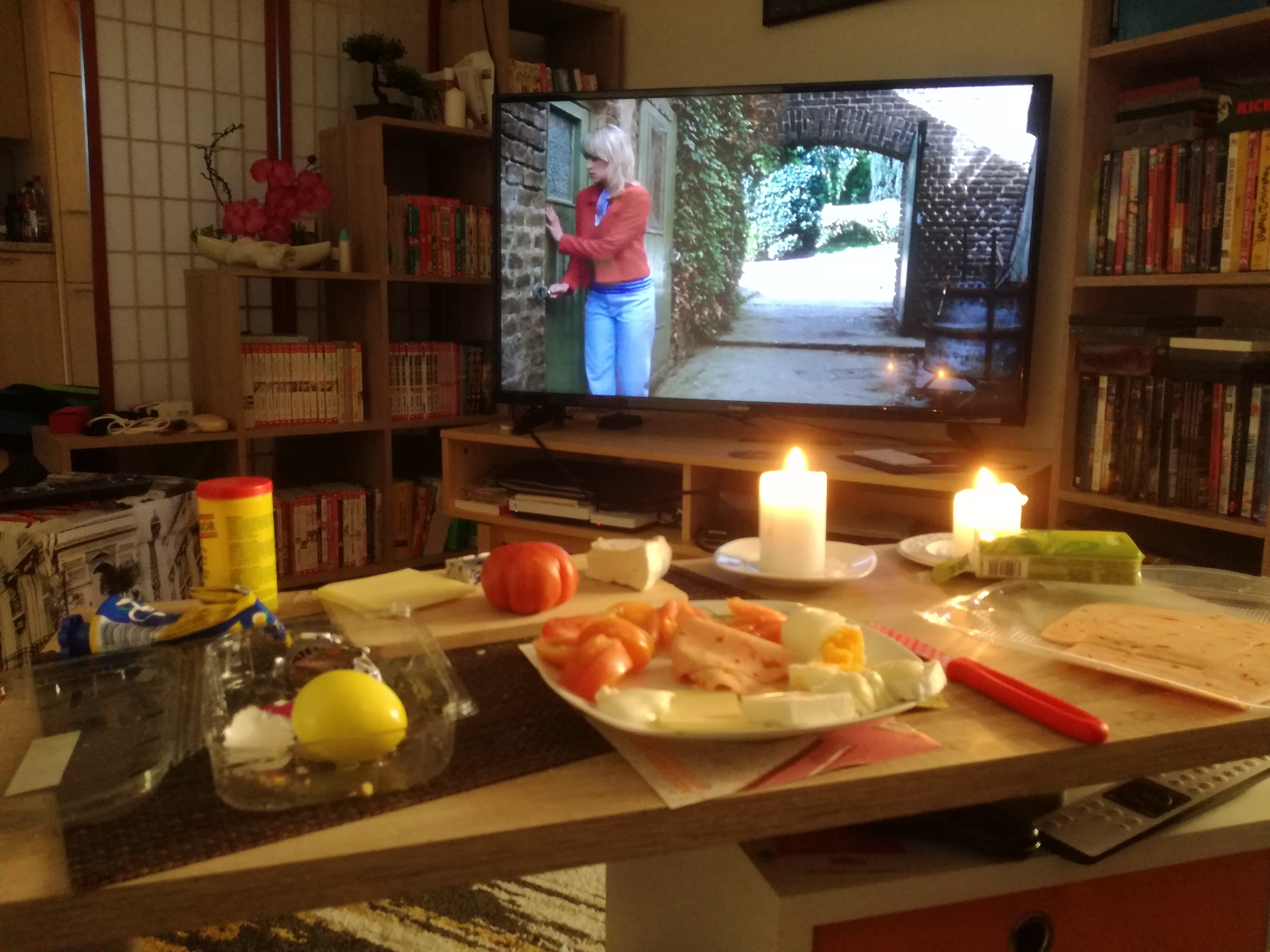 Wow, deine Brotzeit schaut sehr lecker aus. Ich komm sofort vorbei. :D Übrigens, coole Mangas hast du da. O__O Uuuund nicht zu vergessen tolle japanische Deko.